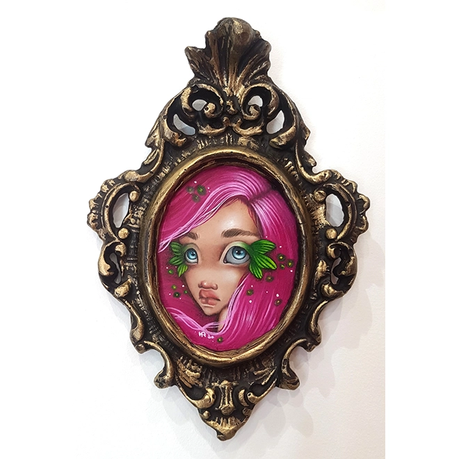 Custom made frame, sanded and carved to enhance the detail, hand painted with acrylics